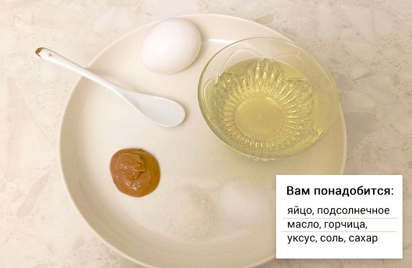 Ингредиенты: яйцо, 200–250 мл подсолнечного масла, чайная ложка готовой горчицы, чайная ложка сахара, ½ чайной ложки соли, чайная ложка столового уксуса (9%).