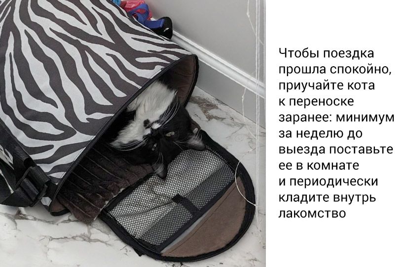 Чтобы поездка прошла спокойно, приучайте кота к переноске заранее: минимум за неделю до выезда поставьте ее в комнате и периодически кладите внутрь лакомство