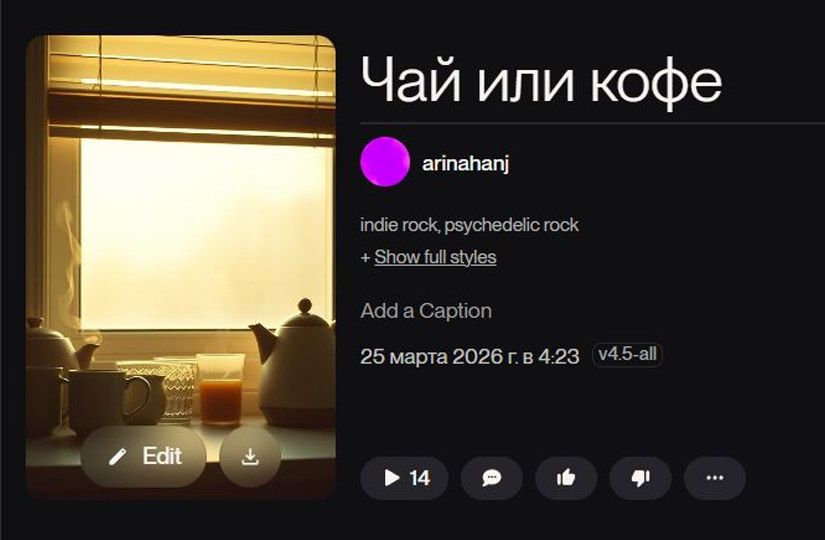 Песня «Чай или кофе» получилась немного грустной, но солнечной. Нейросеть неплохо поймала настроение утренней заторможенности. Наш виртуальный парень с гитарой лениво задается вопросом выбора, но по тексту ясно: ему, в общем-то, все равно. Он меланхоличен и отстранен. В треке все, что мы просили: легкое шипение старой кассеты, «плывущие» гитары, сонный ритм. А еще Suno сгенерировала обложку — подоконник с кружками.
