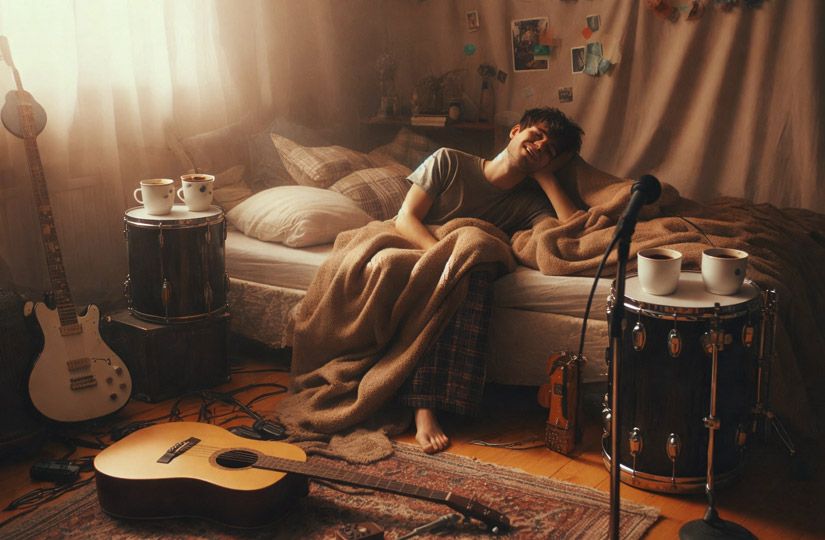 Наш промпт: «Рок, расслабленный инди-психоделик со скоростью 88 ударов в минуту; ленивый мужской вокал на русском языке о выборе между чаем и кофе по утрам; слегка расстроенные гитары для припева, трели аналоговых синтезаторов. В целом уютная атмосфера полусонной спальни — поп-музыка с ленивой, чуть отстраненной манерой исполнения (Rock, Slacker indie-psych at 88 BPM; lazy male vocals in Russian about choosing between tea and coffee in the morning; detuned chorus guitars, Warbly analog synth pads. Overall, a cozy, half-awake bedroom-pop haze with a shrug-in-your-voice delivery)».