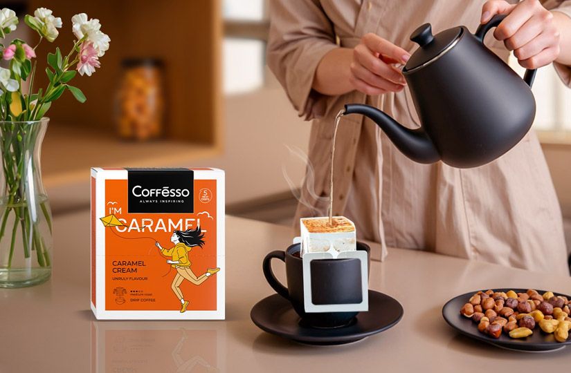 Если сладкие напитки вам не нравятся, но запах карамели кажется привлекательным, можно купить ароматизированный молотый кофе. Например, в дрип-пакетах — специальных саше для заваривания в чашке.