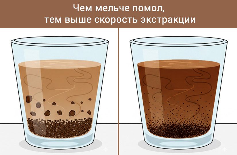 Чем дольше кофе находится в воде, тем крупнее должен быть помол, чтобы напиток не получился слишком горьким или кислым.