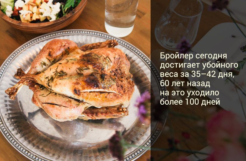 Размер современных бройлеров — результат селекции. За последние 60 лет ученые-птицеводы вывели породы с особым метаболизмом: у кур более длинный кишечник для лучшего усвоения корма, а их обмен веществ настроен на максимальный рост мышц (особенно грудных), а не жира.